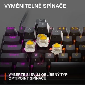 Switchat optikë novator OptiPoint të tastierës SteelSeries Apex 9 Mini reagojnë në çast ndaj ndryshimeve të dritës dhe, të kombinuara me pikën e aktivizimit 1 mm, ju sigurojnë rezultate të larta. Përshtatuni me çdo lojë duke ndryshuar pikën e këmbëzës nga një prekje e shpejtë dhe e butë në 1 mm në një shtypje të sigurt dhe të saktë në 1.5 mm. Personalizoni, përmirësoni ose riparoni tastierën tuaj duke e zëvendësuar me llojin tuaj të preferuar të switchave OptiPoint për të krijuar një tastierë sa më komode dhe të fuqishme.Përmirësoni ndjenjën tuaj të shkrimit dhe saktësinë tuaj të lojës me tastet Double Shot PBT me cilësi të lartë me një strukturë unike. Këto taste janë ndërtuar për të siguruar jetëgjatësi dhe rezistencë ndaj konsumit. Korniza e sipërme metalike e serisë 5000 është identike me aluminin e përdorur në luftëtarët luftarakë, gjë që garanton qëndrueshmëri dhe stabilitet më të madh të strukturës në çdo kohë. Kablloja USB Type-C e gërshetuar e qëndrueshme dhe e shkëputshme i reziston konsumimit të përditshëm.